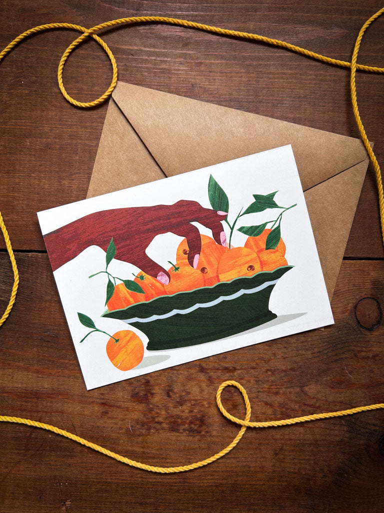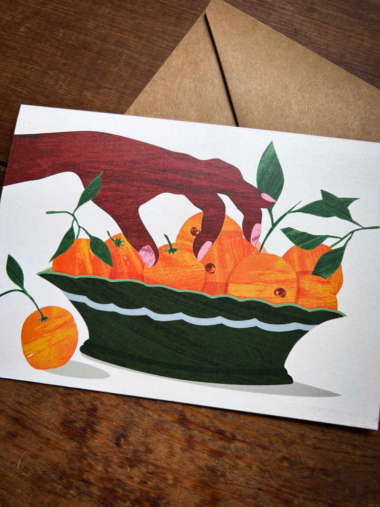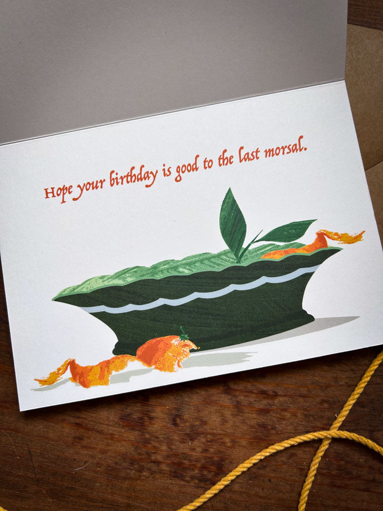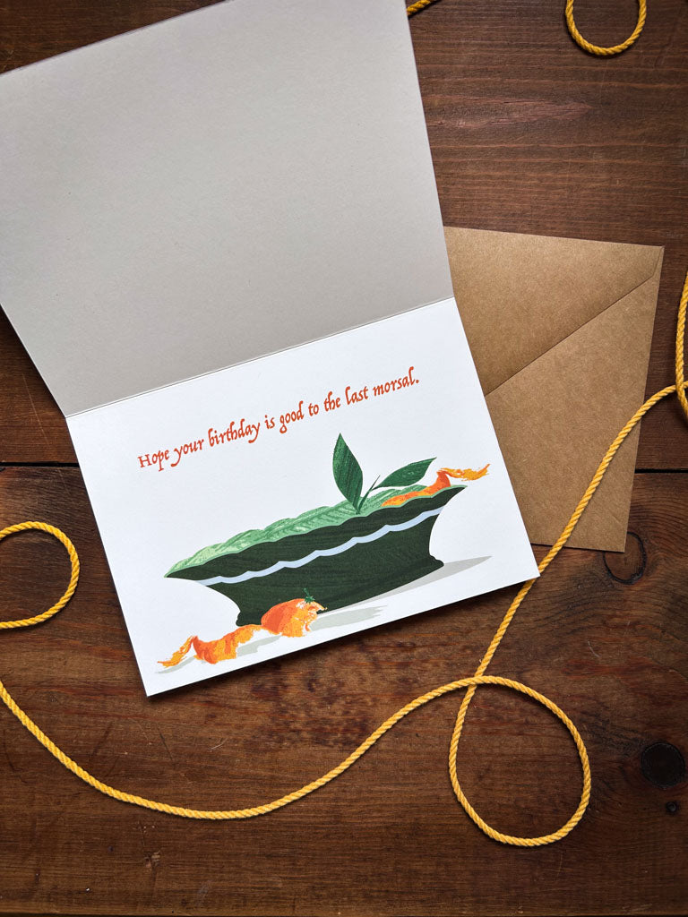 Celebrate with a card as festive as the party! This beautiful greeting card features charming hand-collaged artwork—a vibrant orange being plucked from a bowl on the front, with an empty bowl and heartfelt message inside: "Hope your birthday is good to the last morsal." Perfect for sharing warm wishes with someone special. Includes a coordinating kraft paper envelope.